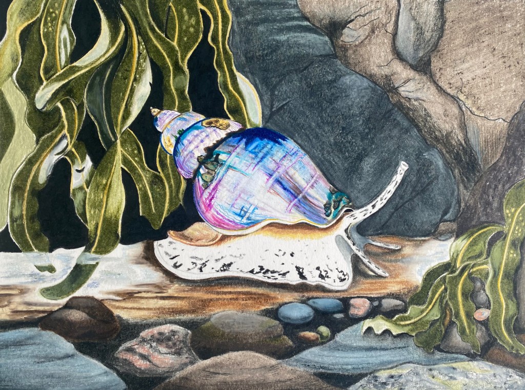For this marine snail, done as a 9”x12” colored pencil illustration, I emphasized the colors to give the illustration a mythical feel.