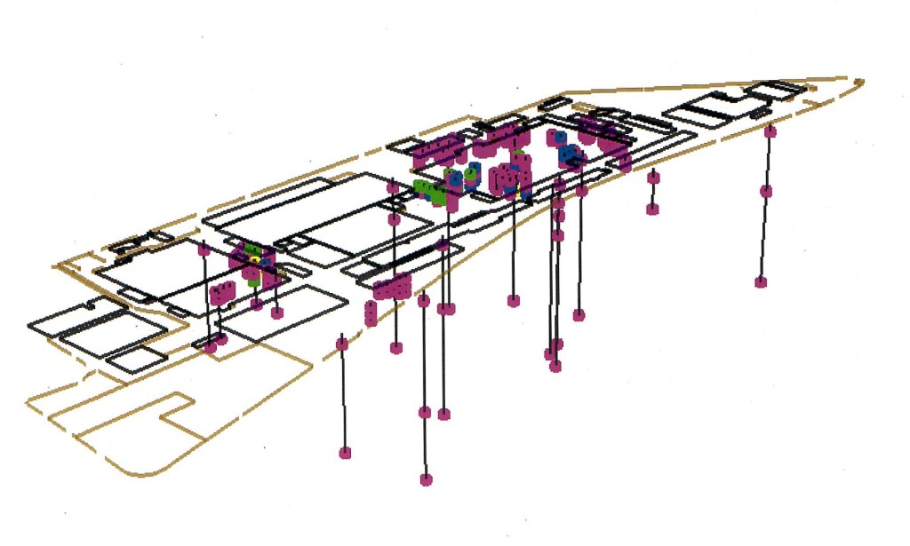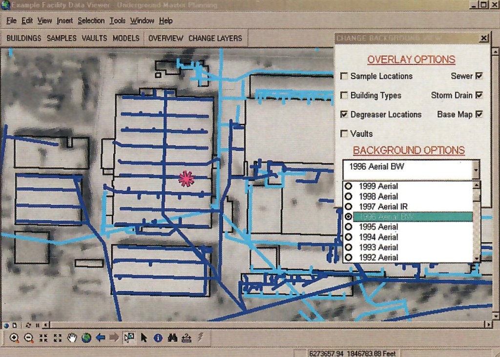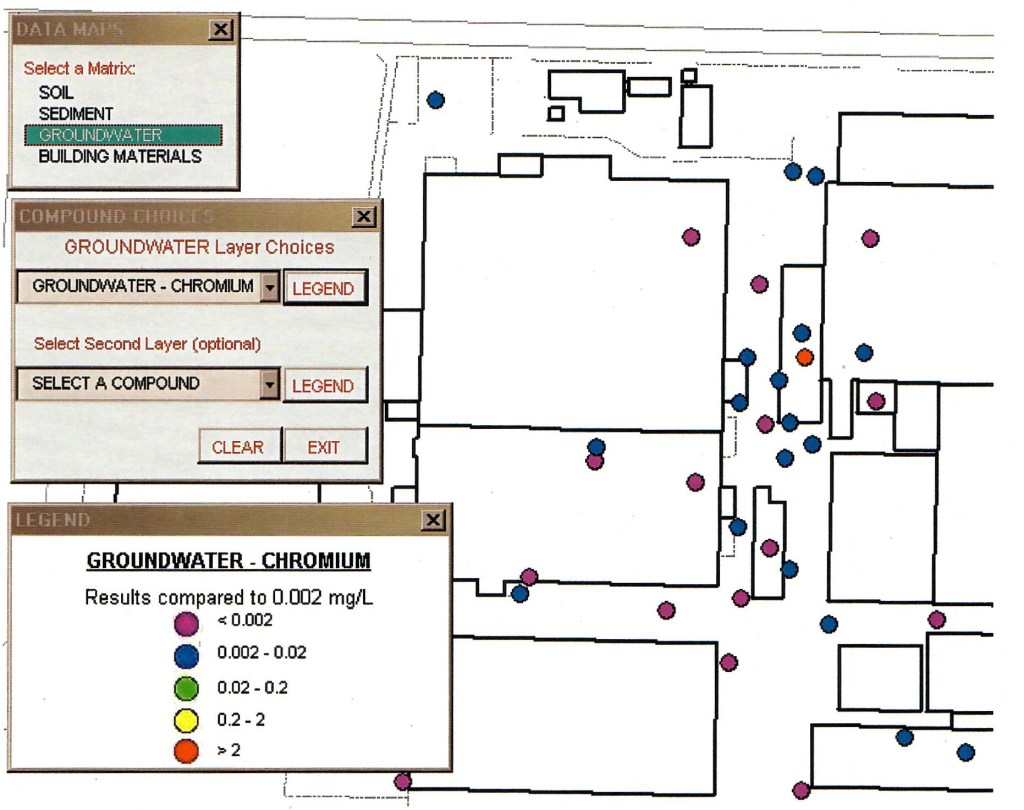 This was a unique use of GIS to create a custom facility data viewer accessible to the clients. While many of the features of this GIS are now considered standard, such as being able to view a site photograph when clicking on a location, this entire GIS was pushing the boundaries of the then available technology. The GIS was built in 2006 by myself while working at Haley & Aldrich to allow for a number of data types to be shown over time. The data shown here is the example data publicly presented at the Eastern Region Association of Physical Plant Administrators conference in 2006. The presentation was made jointly by myself, the sole GIS developer assigned to the project and the principal engineer assigned to the entire scope of the project. The viewer was built using ArcObjects to allow the clients, which included a team of lawyers, to review the data to build their case. The entire GIS needed to be built with extreme precision for defensibility in court. The viewer allowed for clients to view any of the results in a 3D model on demand without needing to understand how to operate GIS software. The comparison units were preselected and written into the code for each compound to ensure the integrity of the visual analysis.