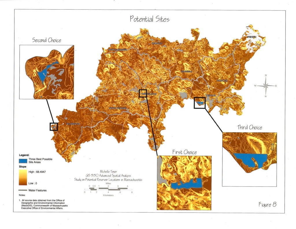 This project was completed as part of my Masters Degree in Informatics with a GIS concentration at Northeastern University. As a local to the Quabbin Reservoir region in Massachusetts which eliminated a number of towns, I though it would be interesting to conduct a study using more advanced GIS technology to determine the suitability for a ficticious new reservoir. A number of factors were analyzed to create new information including population density, elevation, calculated slope, and the movement of water in existing watersheds, to narrow down locations to one area of Massachusetts in the Northeast region. Three possible sites were selected based on the least impacts to population and protected species.