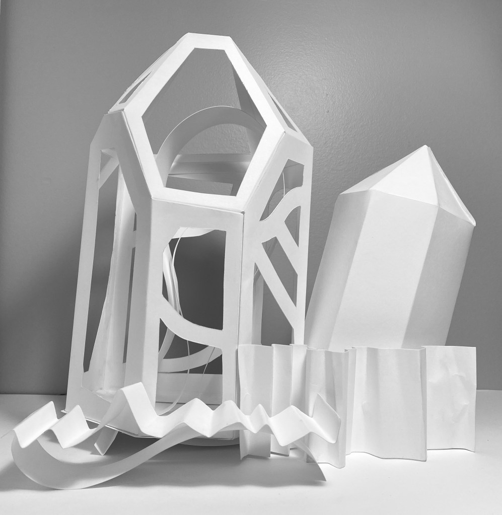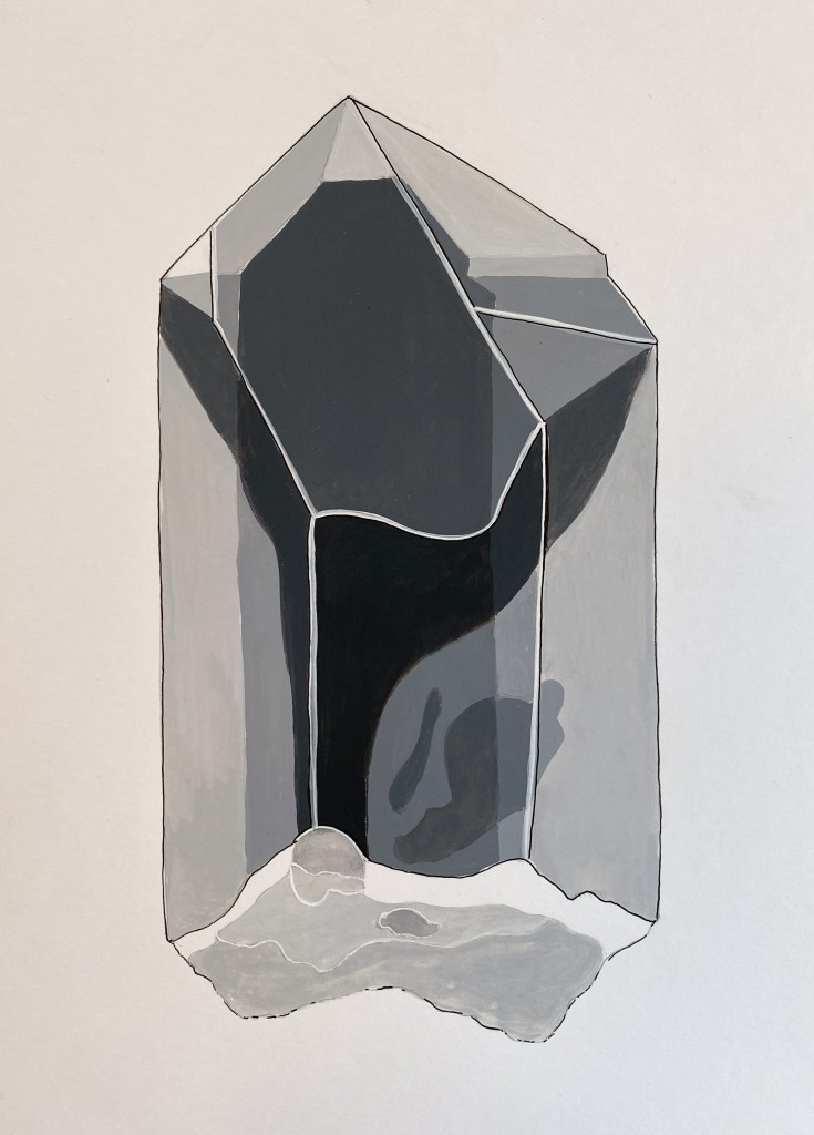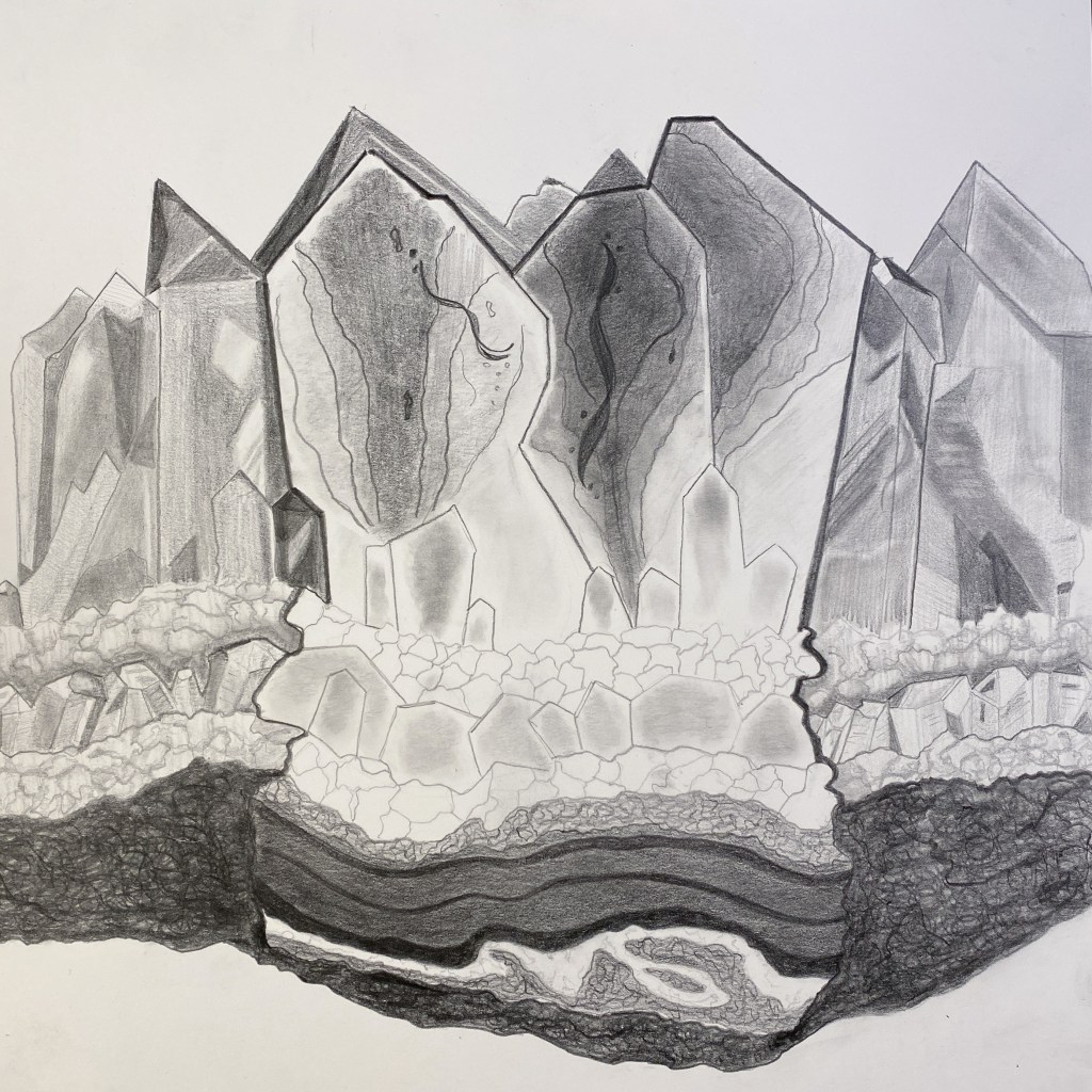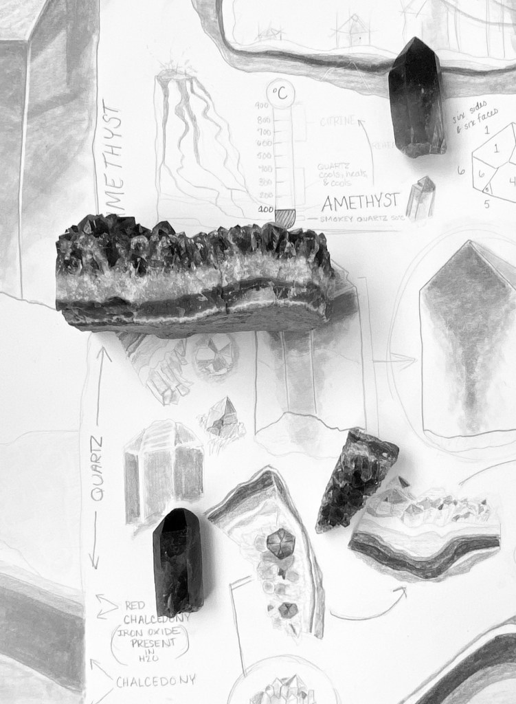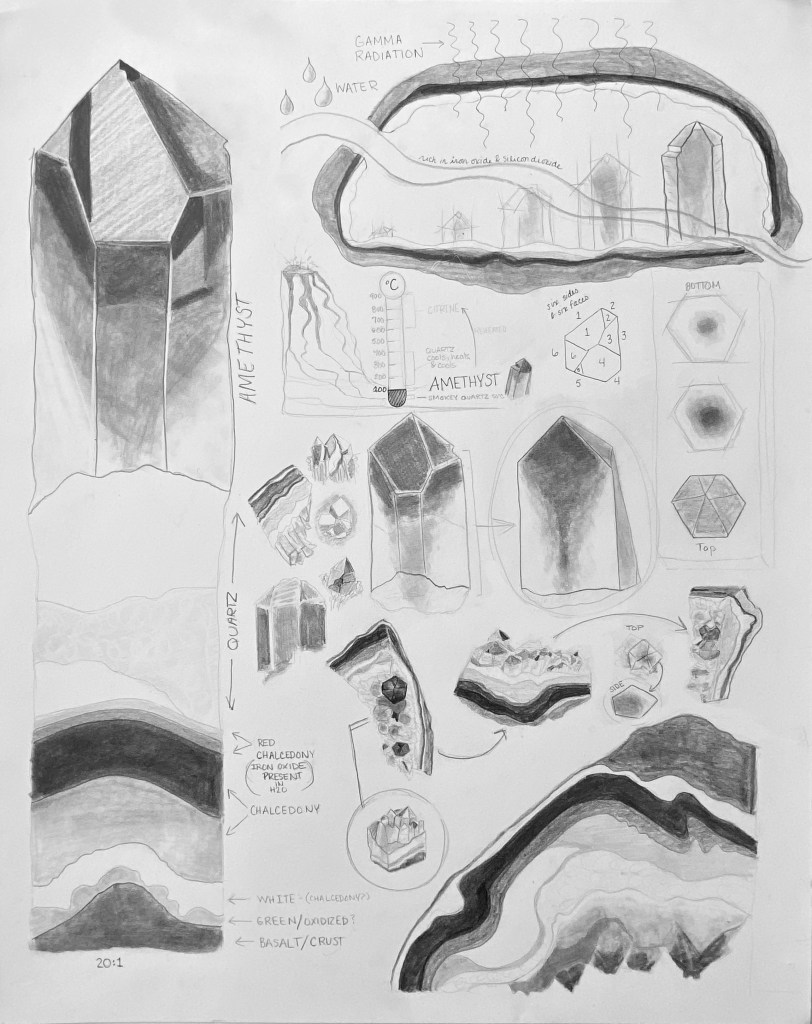 After thorough research of the development of amethyst crystals, several types of models and artist renderings were created to explore the inside and outside of the crystal. Studies were done in pencil, gouache, paper models, and watercolor.